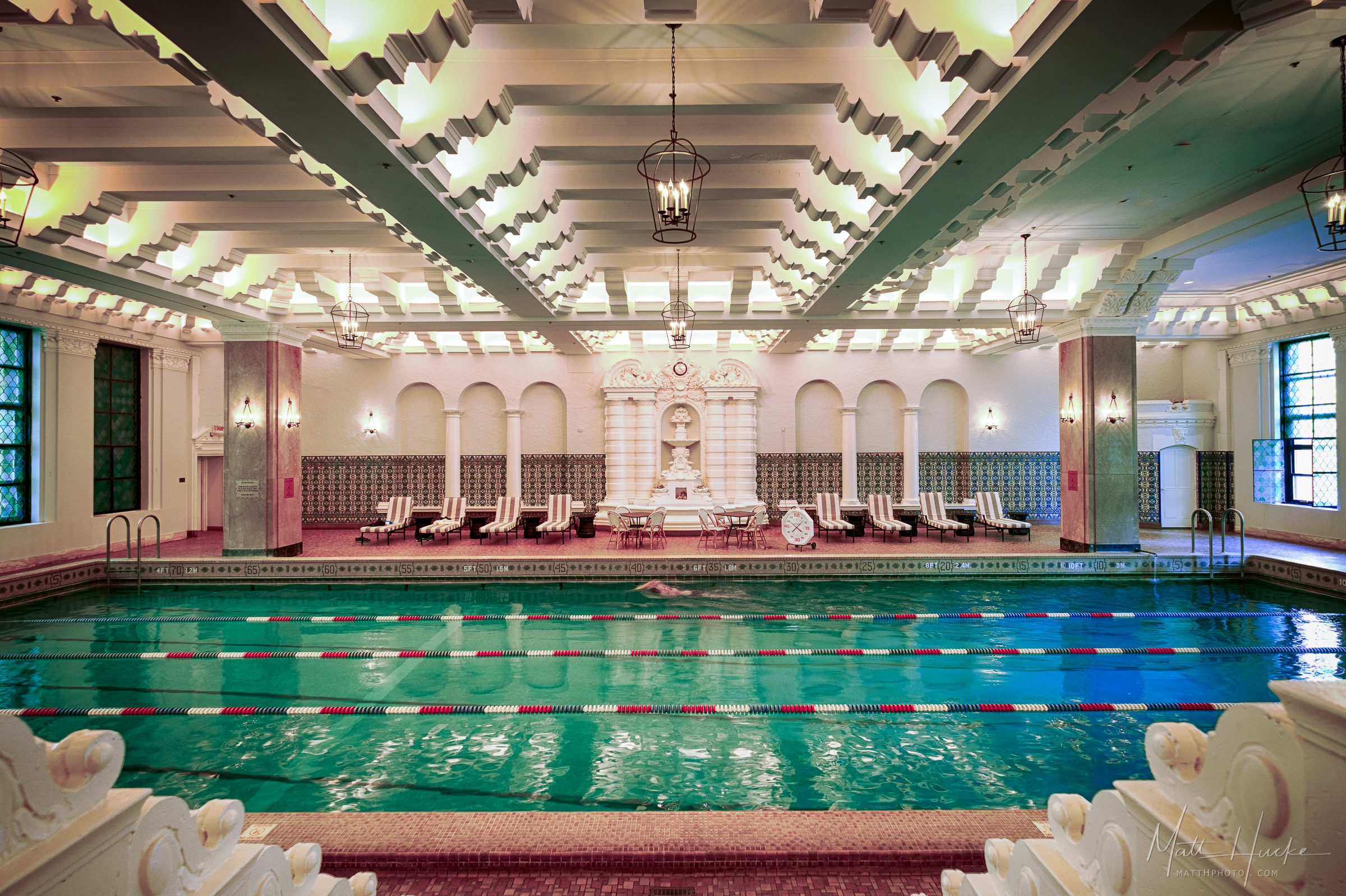 When the Junior Olympic sized swimming pool at the Medinah Athletic Club in Chicago was completed in 1929, it was a remarkable feat of engineering - on the 14th floor of a skyscraper, it was then highest pool in the world (above ground level). Some call it the "Johnny Weissmuller Pool", as the Olympic gold medalist and Tarzan actor trained here.