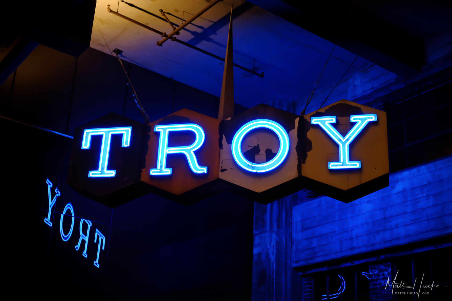 Rooftop neon sign from the defunct Troy Laundry in Seattle. After Amazon bought the building, they gutted it and erected a skyscraper in the shell of the old brick laundry, which now provides a covered walkway leading to the entrances of the new building. The neon sign was relocated from the rooftop to hang inside.