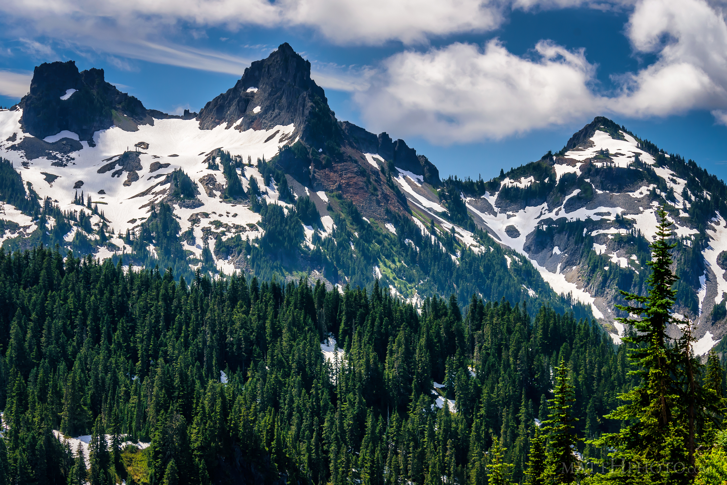 Left to right, an unnamed peak, Pinnacle Peak, and Plummer Peak, of the Tatoosh Range.