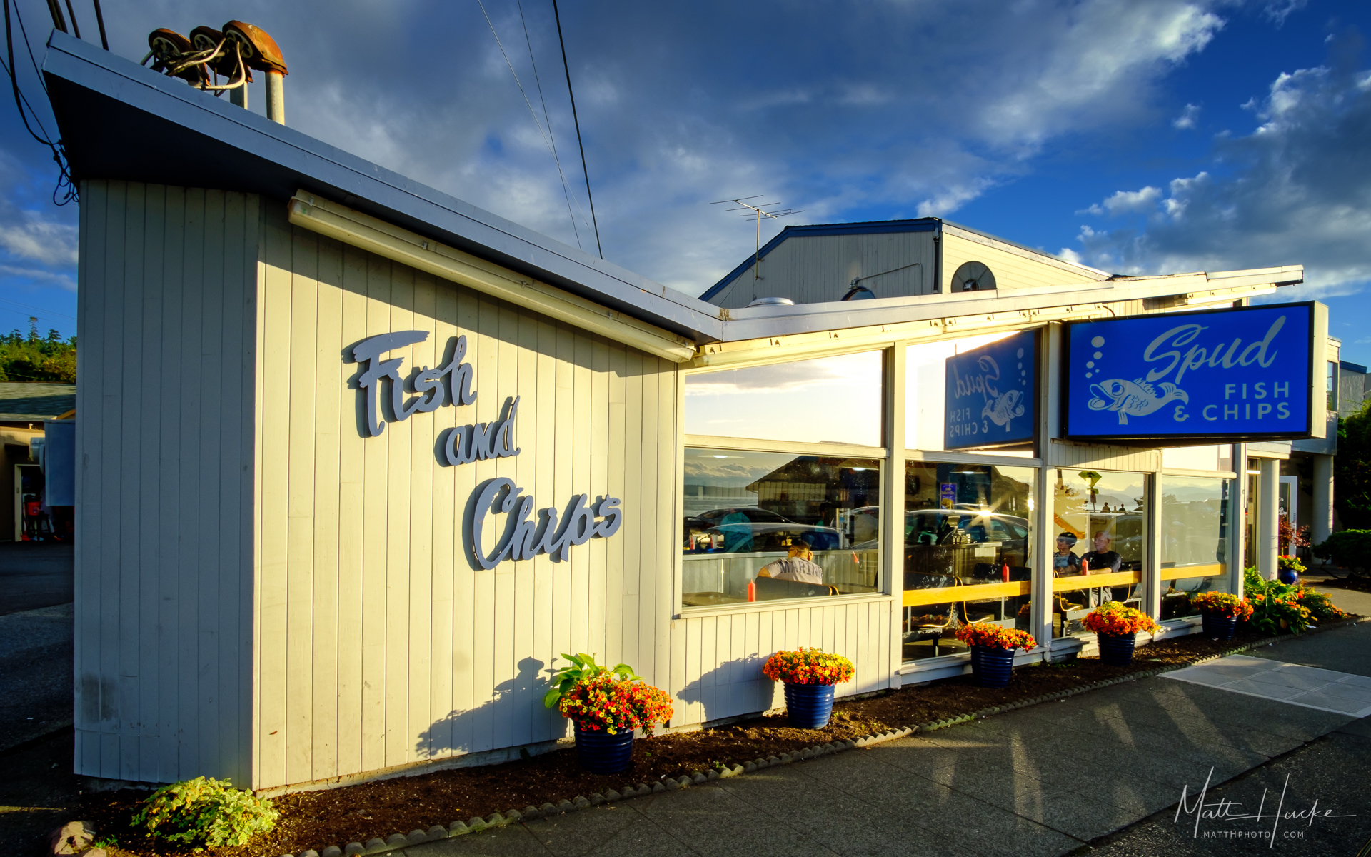 Alki Spud Fish & Chips, West Seattle. Brothers Jack and Frank Alger started selling fish and chips (ten cents for two pieces of ling cod and fries in a cardboard boat) out of their Alki Avenue garage in 1935, cutting a takeout window in the side of the building. During WWII, rationing made oil for frying difficult to obtain, and Spud nearly had to close, but neighbors banded together to donate their oil ration tickets, saving the fish and chip stand.