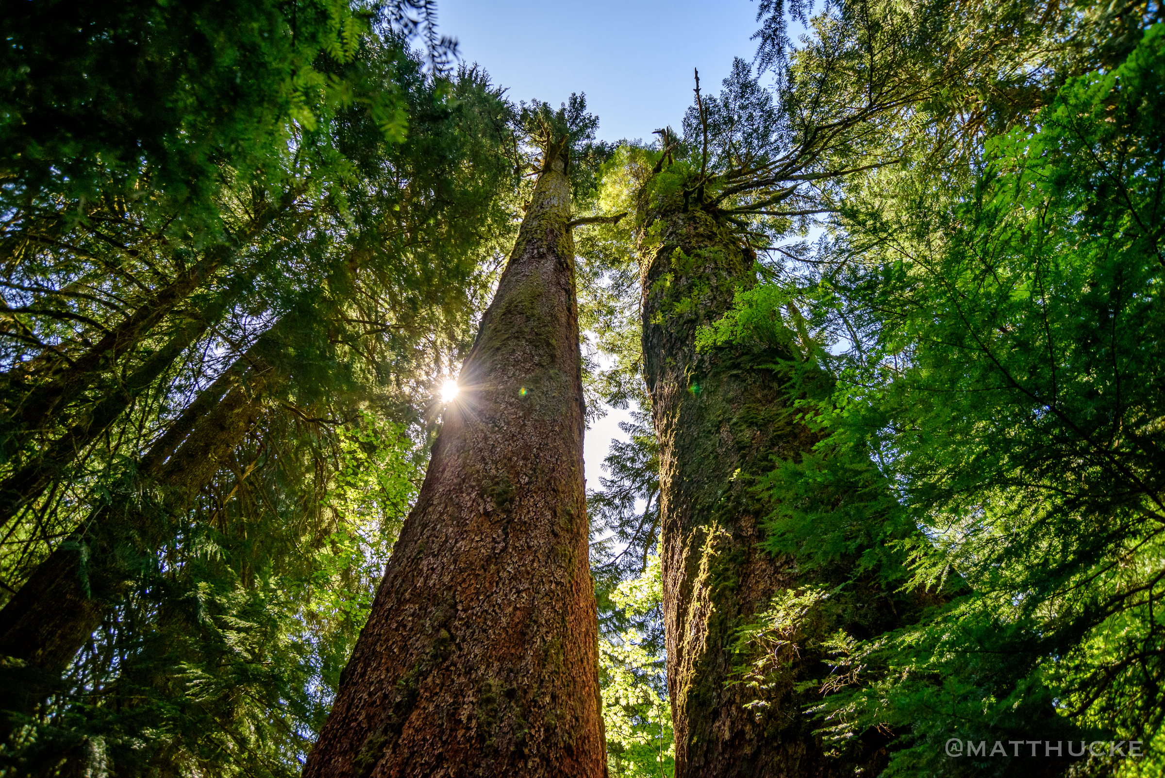 Ancient Douglas-fir trees at the Grove of the Patriarchs, Mount Rainier National Park. Both are over one thousand years old, and have just barely enough remaining foliage to keep them alive. One was truncated by a storm; the other has a dead crown.