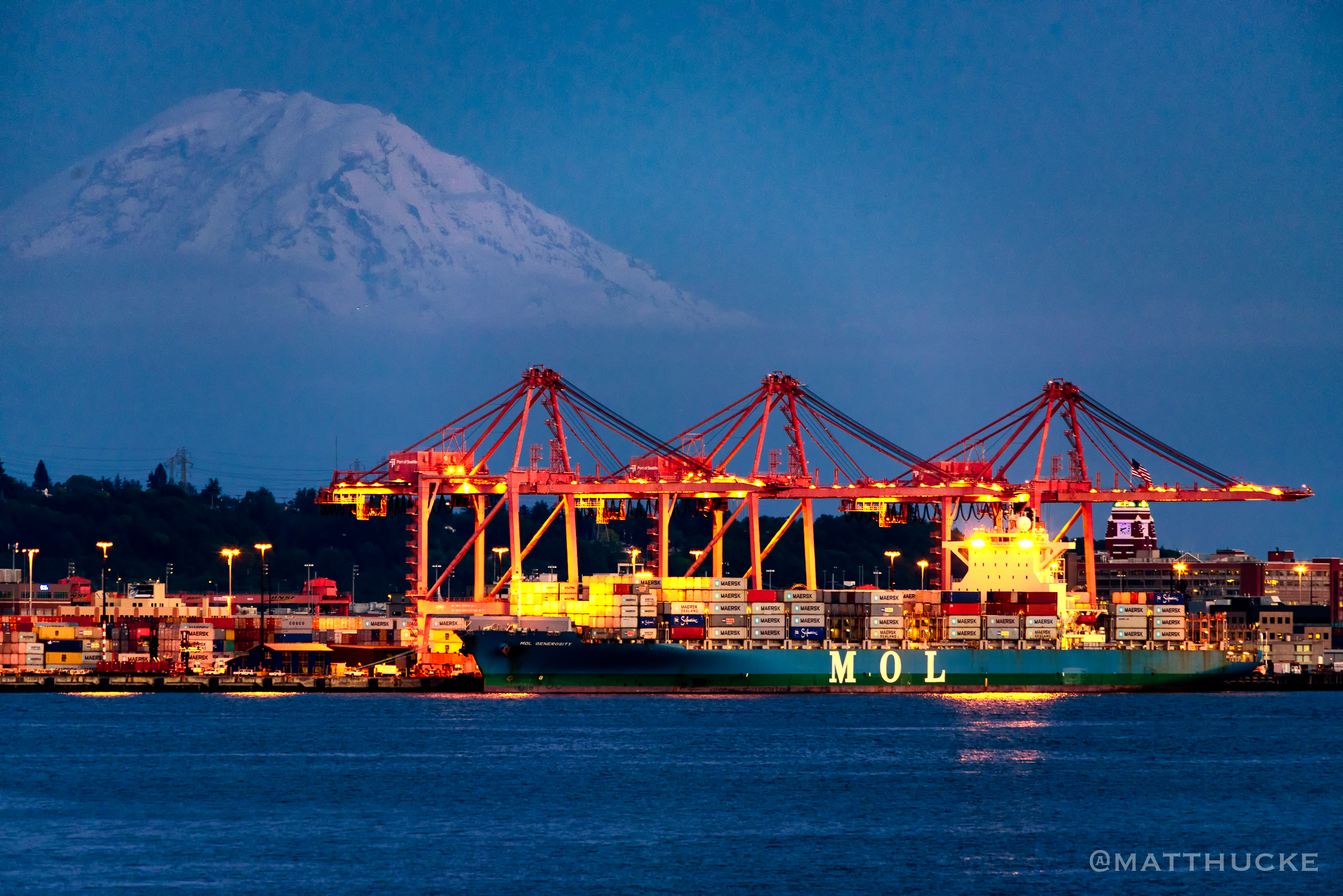 Container ship MOL Generosity in the Port of Seattle. Also, a big volcano that will someday kill us all.