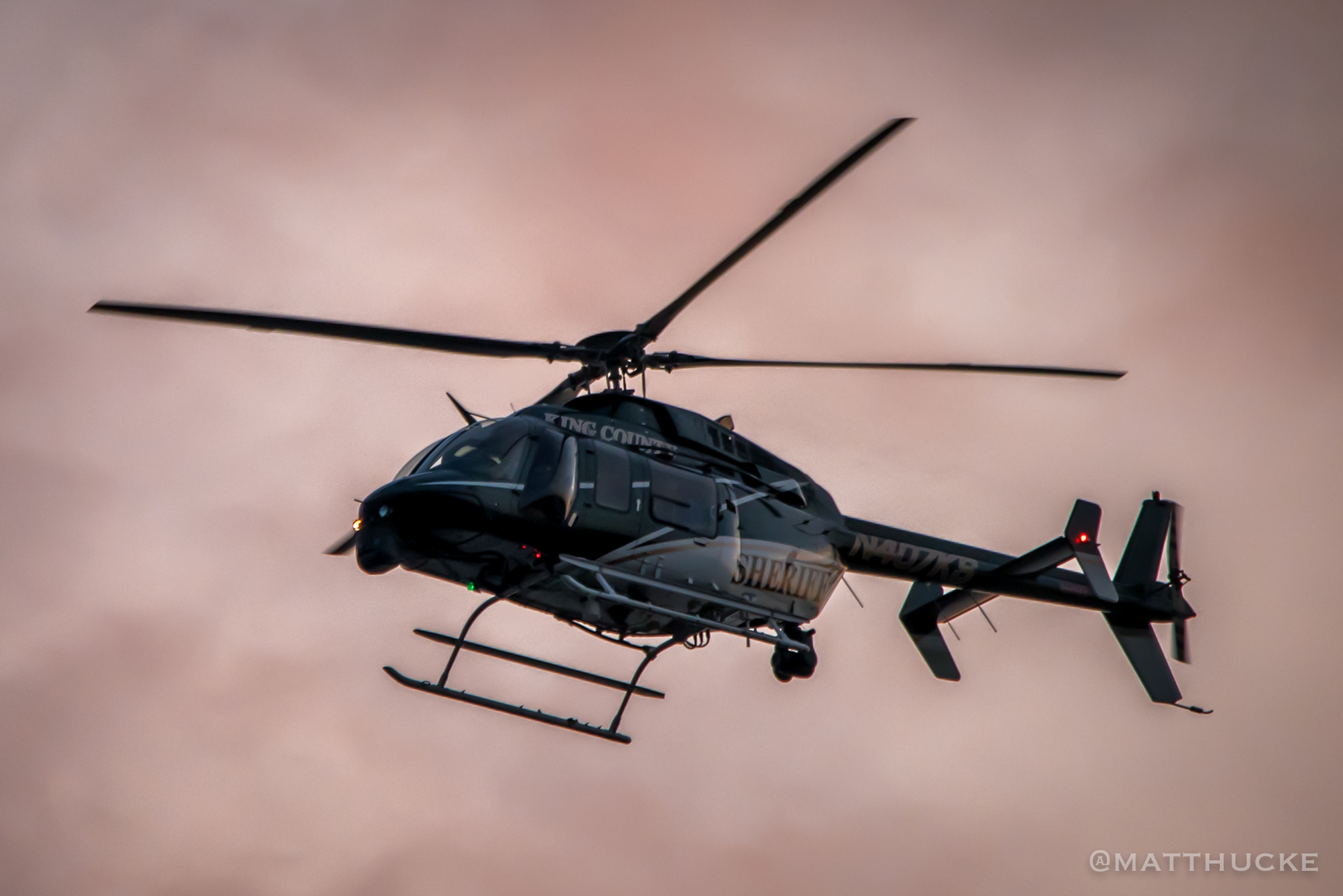 King County Sheriff's helicopter over Puget Sound, from Myrtle Edwards Park, at sunset