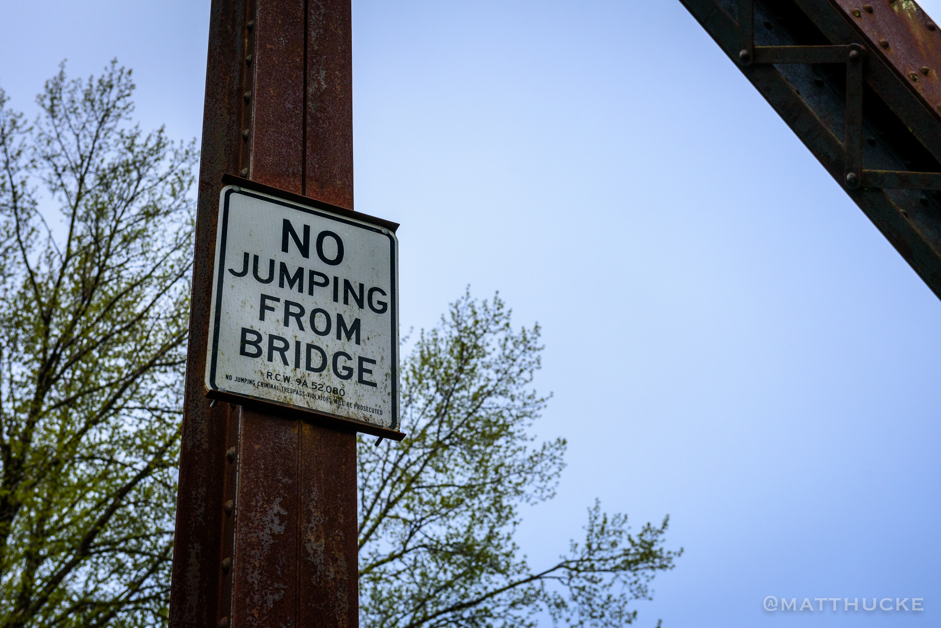 Originally a railway bridge over the Snoqualmie River, built to service the saw mill (see previous posting), the railroad was ripped out after the mill closed (1989), the elevated approach on one side of the bridge torn down, and the bridge converted to a foot bridge, part of a nature trail. A stairway leads up to it on the Reinig Road side, the second stairway built on the site after the first was destroyed by an arsonist.