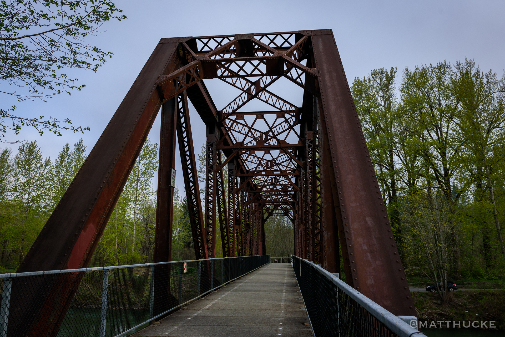 Originally a railway bridge over the Snoqualmie River, built to service the saw mill (see previous posting), the railroad was ripped out after the mill closed (1989), the elevated approach on one side of the bridge torn down, and the bridge converted to a foot bridge, part of a nature trail. A stairway leads up to it on the Reinig Road side, the second stairway built on the site after the first was destroyed by an arsonist.