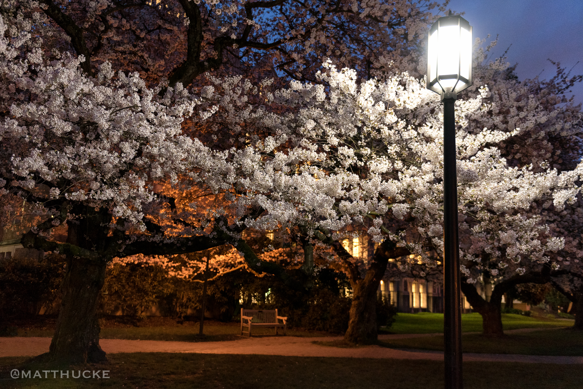 - bench, cherry blossom, cherry trees, explore, flickr_explore, lamp, lamp post, nature, night, seattle, spring, university, university of washington, uw