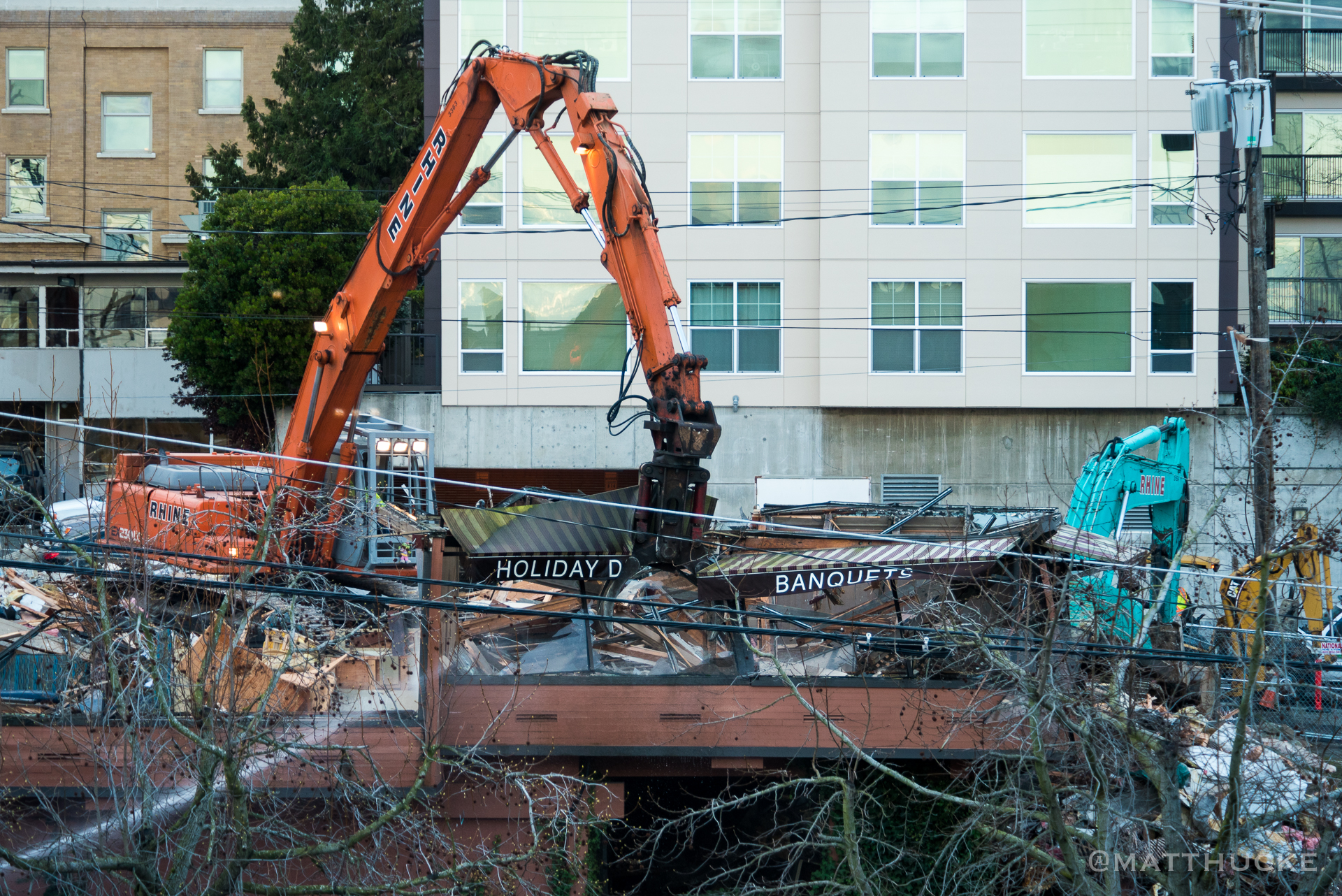 Demolition of the former Kaspar's Special Events & Catering continues. Just out of frame at lower left, a worker with a hose is spraying the building with water (the streak of white) to lay the dust.