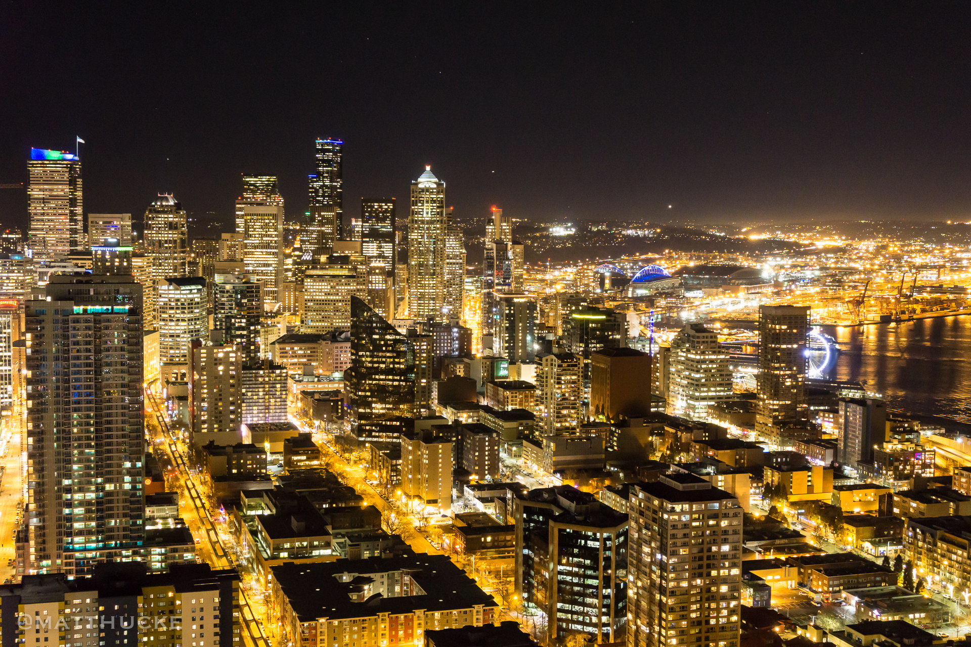 As seen from atop the Space Needle. 2 Union Square, CenturyLink Field, and a few other buildings are lit up in Seahawks colours.