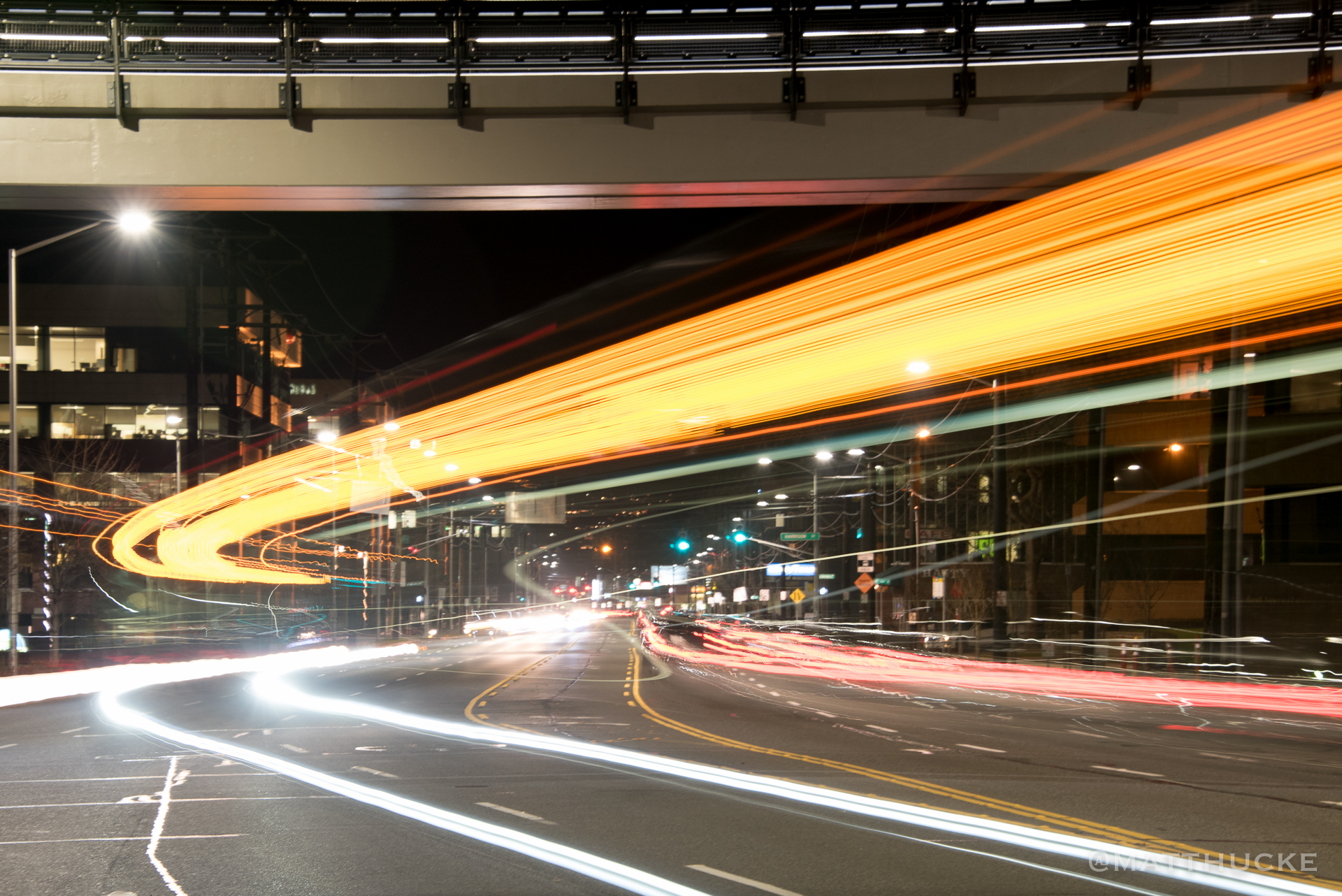 Corner of Elliot and Western, Seattle; 8-second exposure of a bus going by.
