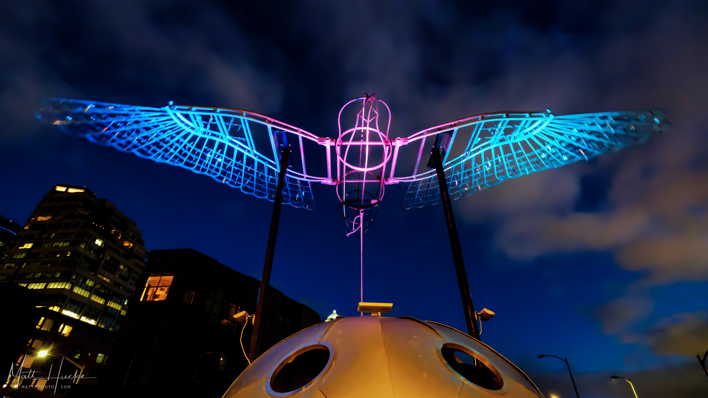 Mechanical seagull, wingspan about 20 feet, as part of Seattle's Alaskan Way Viaduct shutdown festival.