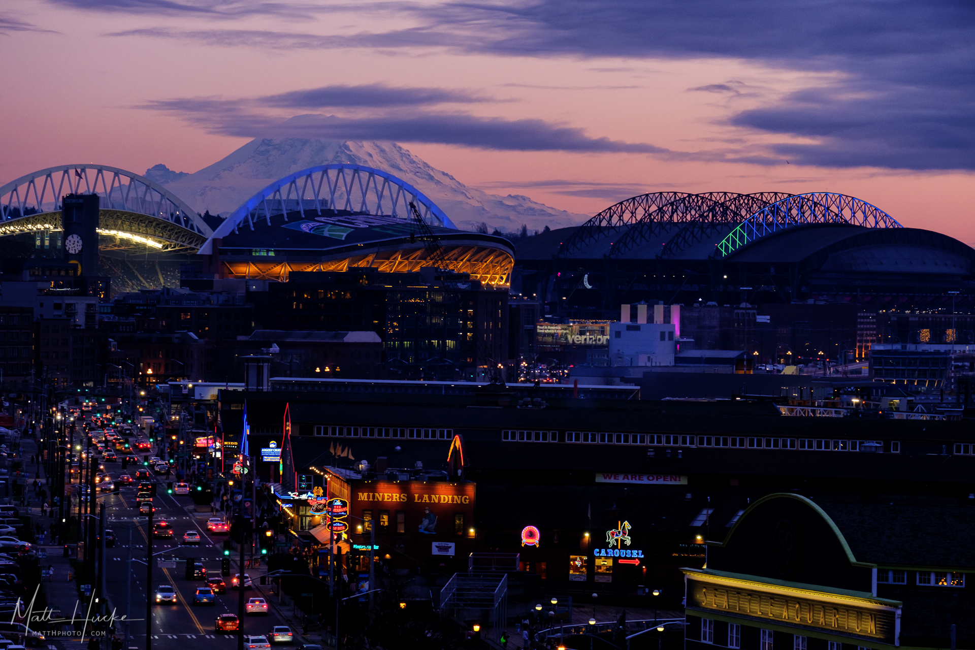 - alaskan way seattle, miners landing, rainier, seattle, sunset