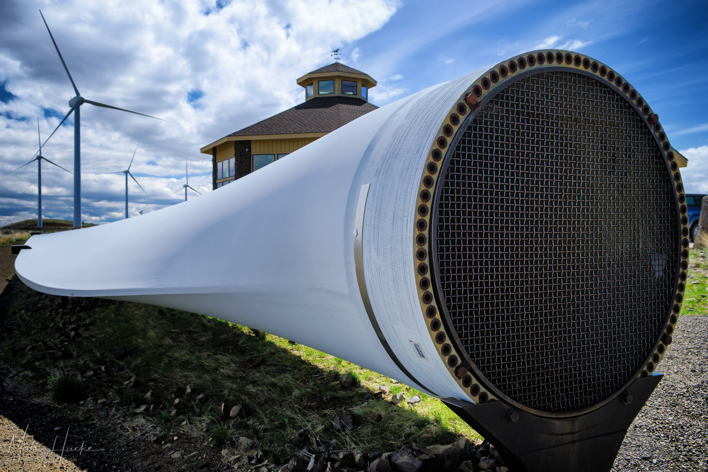 Blade from a Vestas V80 wind turbine, damaged during construction, now an exhibit at the Wild Horse Wind Farm visitor center. 129 feet long. The open end, where it would attach to the hub, is about 6 feet in diameter.