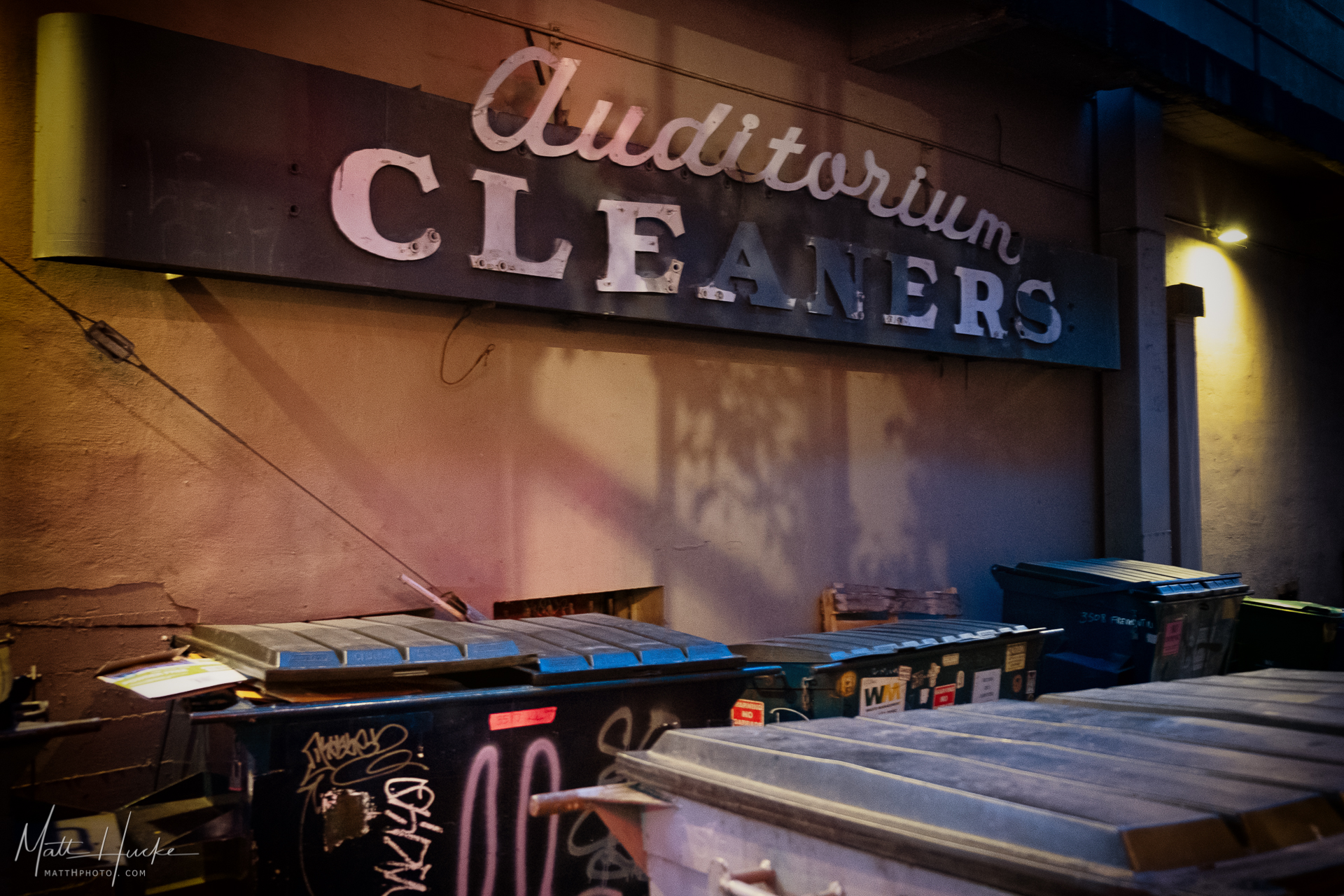 Auditorium Cleaners operated from 1930 to 1991 in the Odd Fellows Lodge #86 building in Fremont, Seattle. When they closed the neon sign (stripped of its glass) was relocated from the front of the building to the alley behind. (Directions: just southeast of the Lenin Statue)