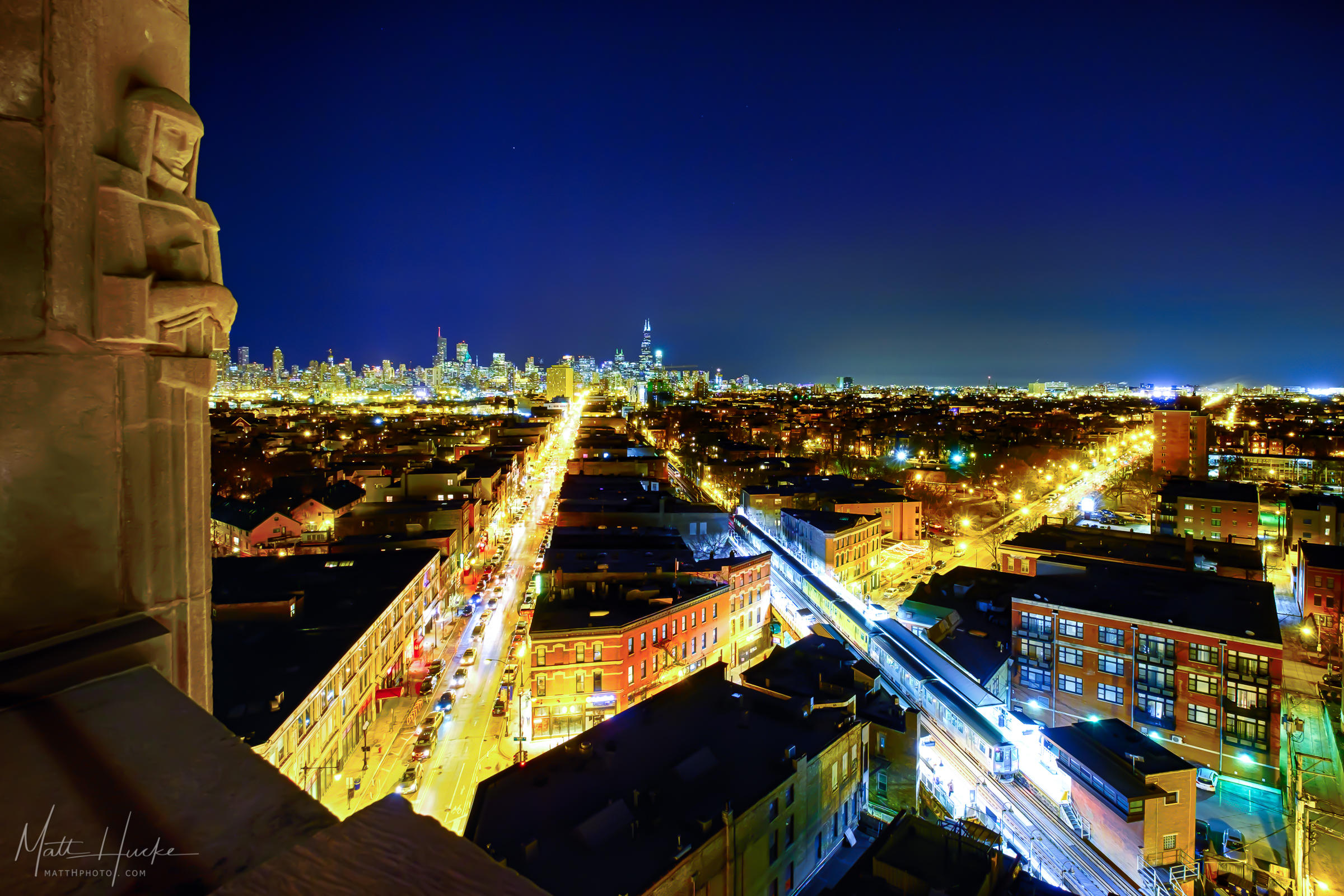 Shot from the roof of the Robey Hotel, Chicago. Milwaukee avenue extends upwards from the bottom left, Damen avenue extends to the center-right. The Damen Blue Line El station is at lower right.