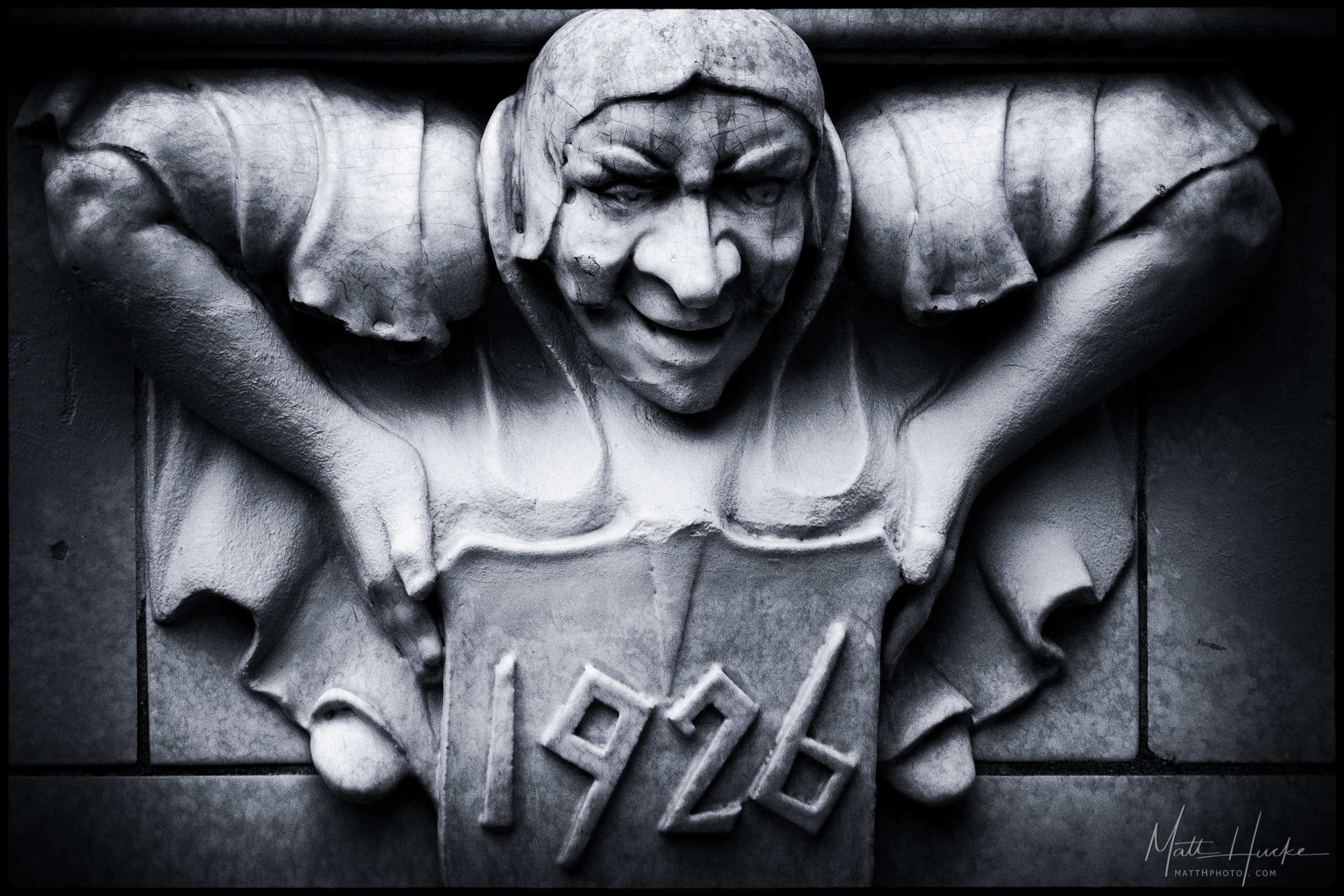 - architecture, camlin hotel, hotel, seattle, statue, stonework