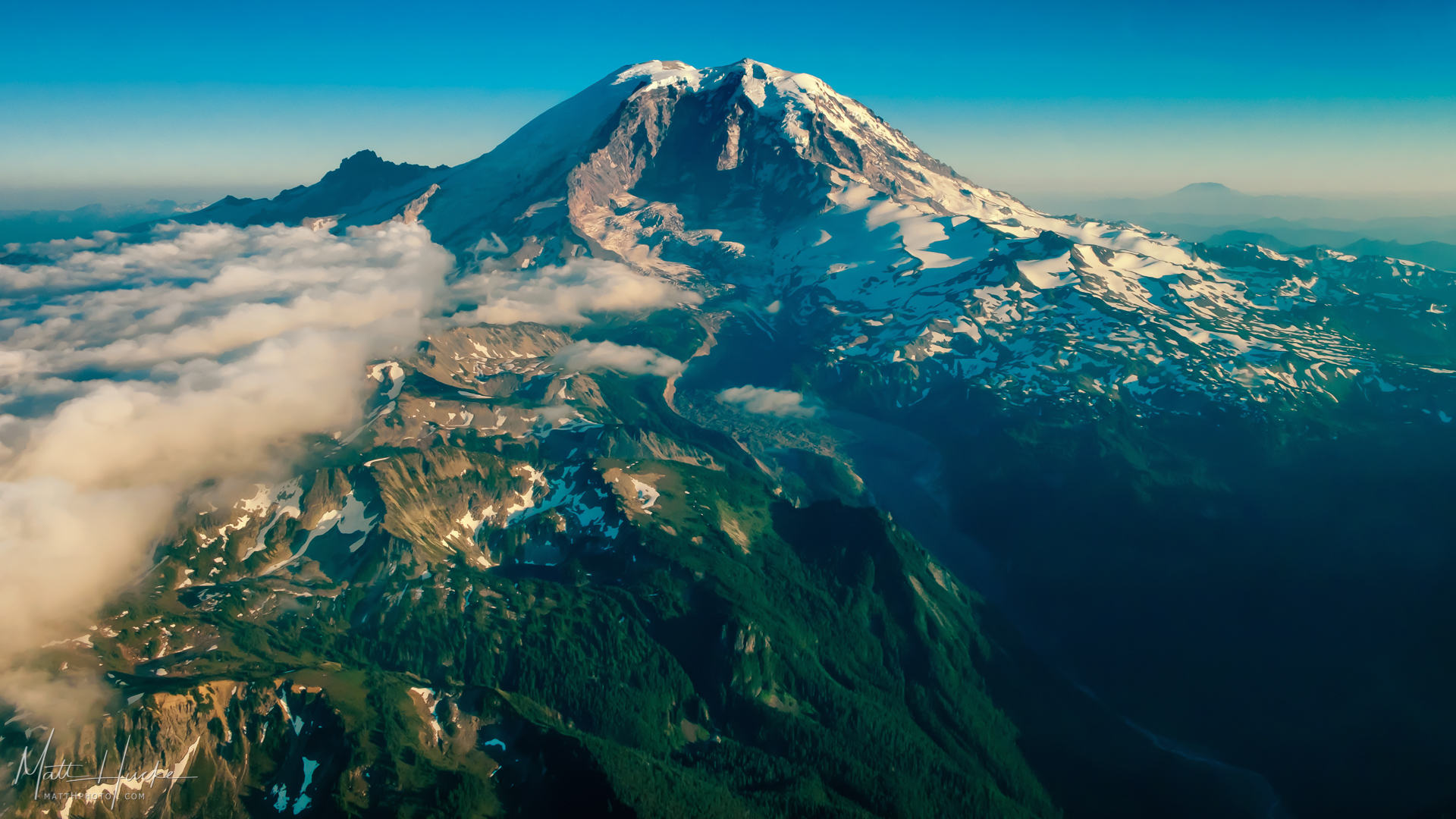 - aerial, carbon glacier, carbon river, mount rainier, mount rainier national park, volcano, washington state
