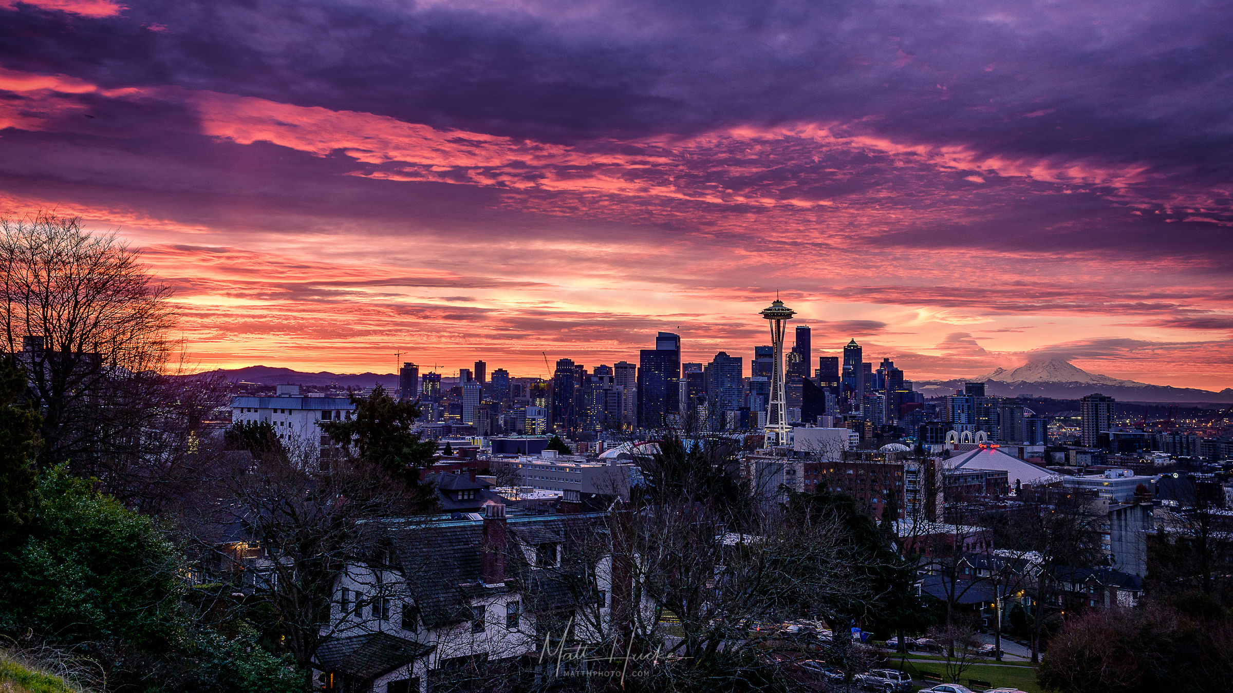 - kerry park, lenticular clouds, mount rainier, rainier, seattle, skyline, space needle, sunrise