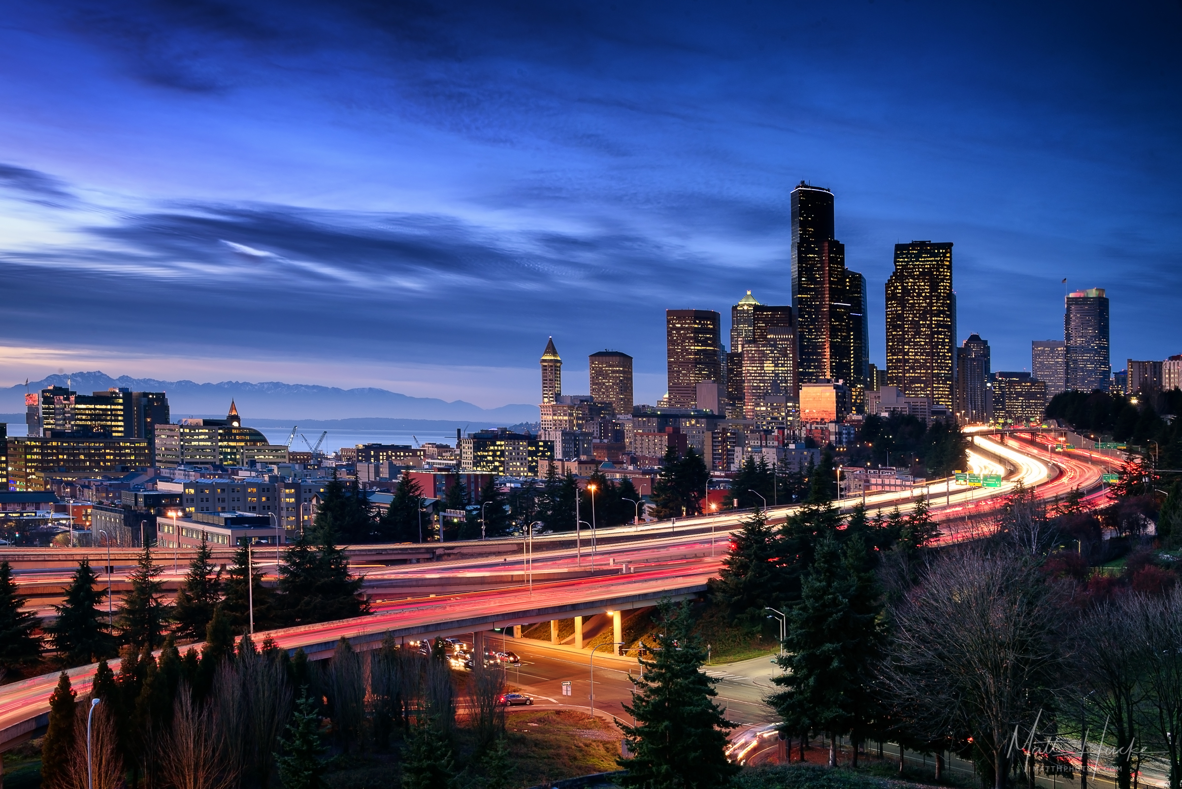 - city, downtown, interstate, interstate 5, jose rizal bridge, light trails, Red, seattle
