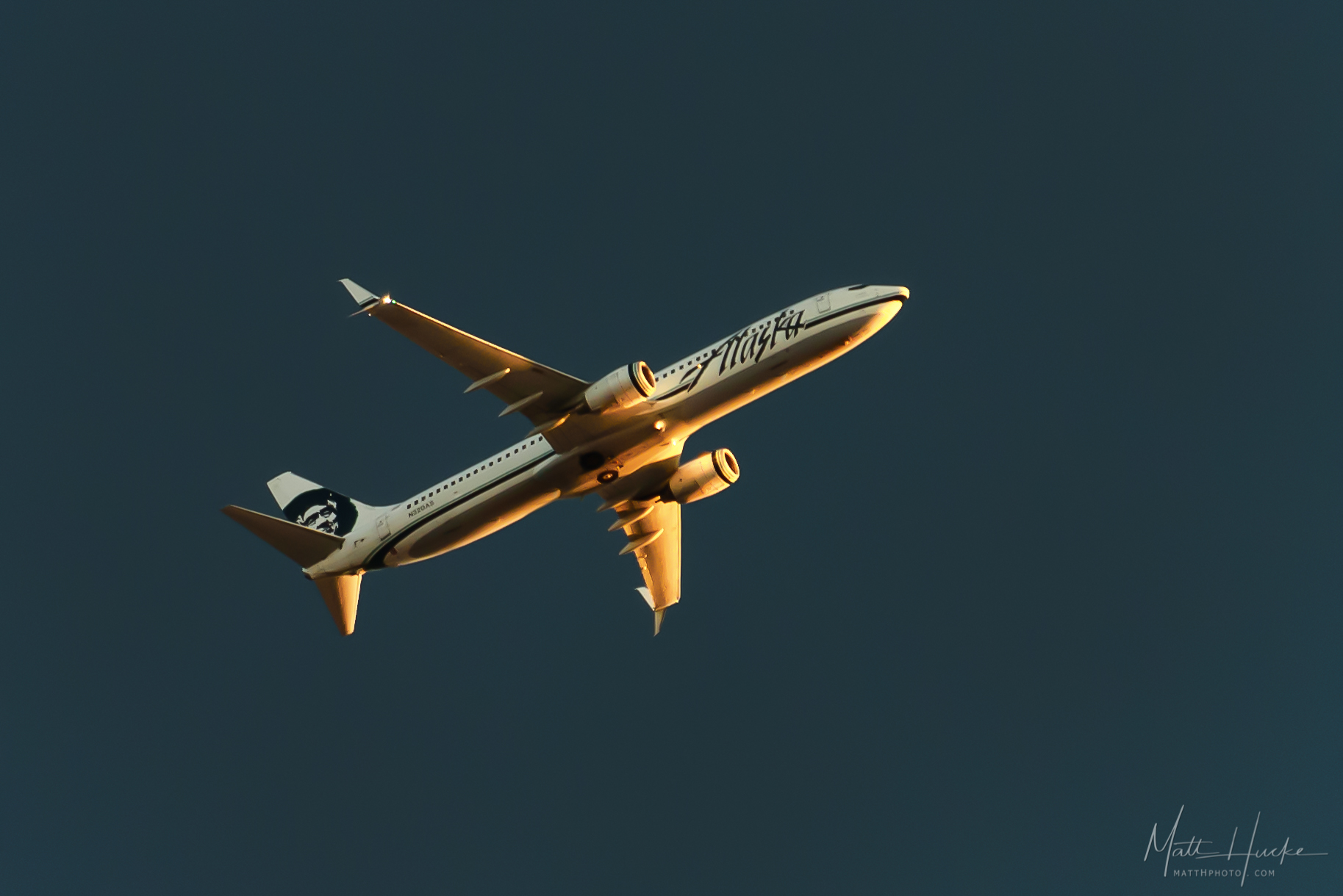 Alaska Airlines N320AS, a Boeing 737-990, northbound from Sea-Tac at sunset.