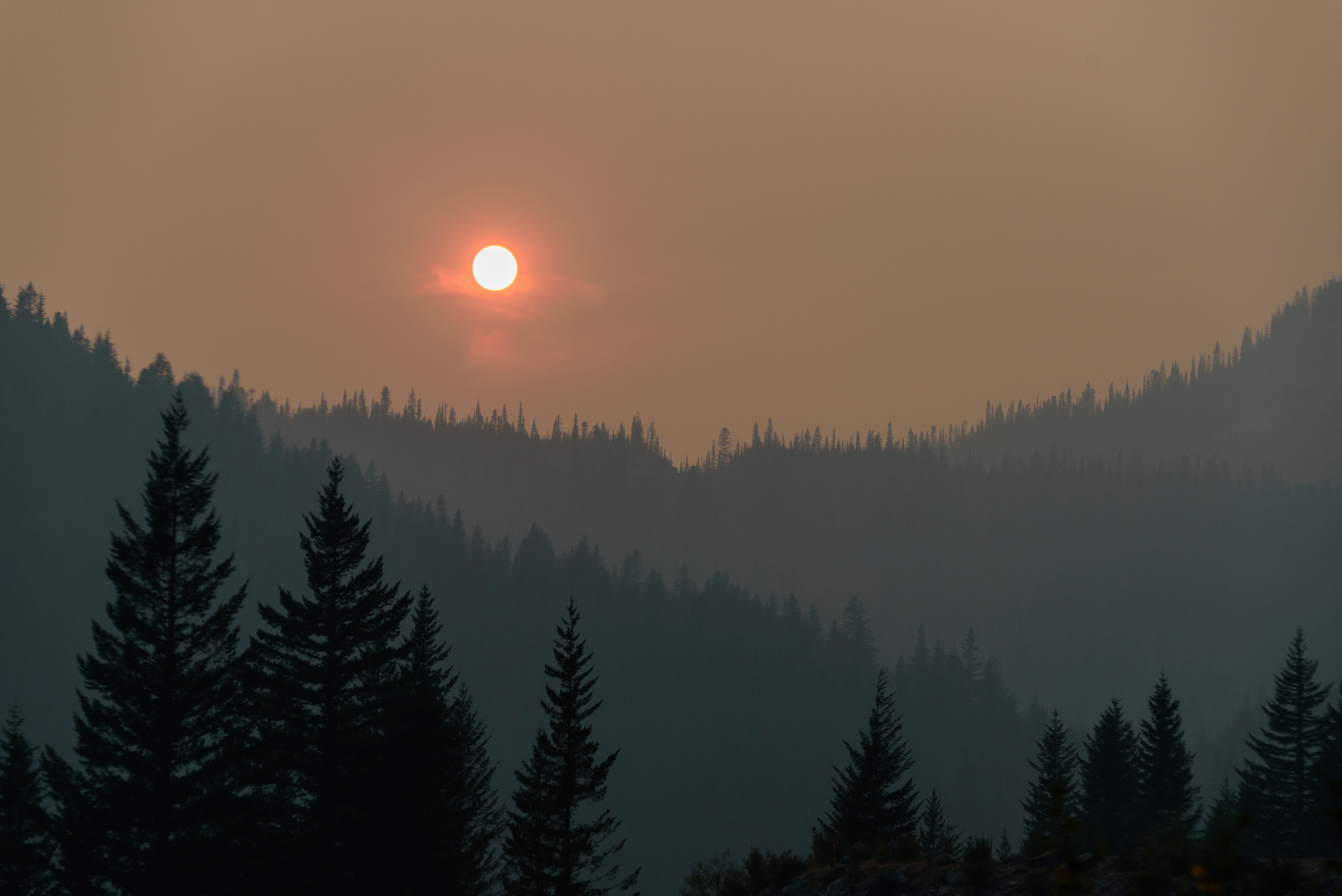 Smoke from the September 2017 Wildfires causes a thick haze - and red sun - over Stevens Canyon, Mount Rainier. This was a full hour before sunset, and the sun was a deep red.