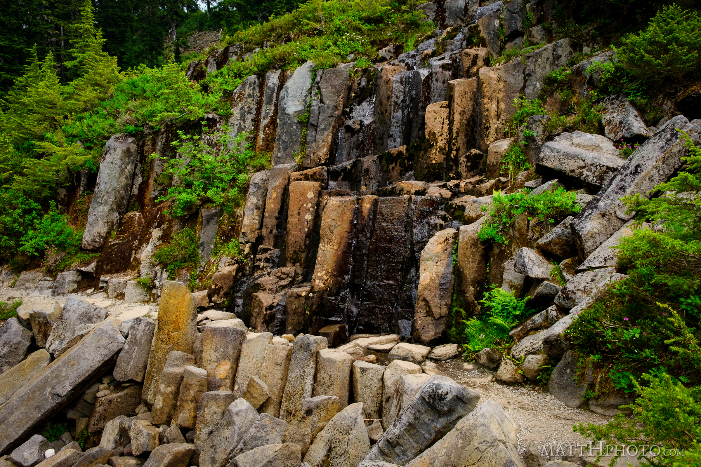 Columnar basalt (cooled lava) on Bagley Lakes trail near Mount Baker.