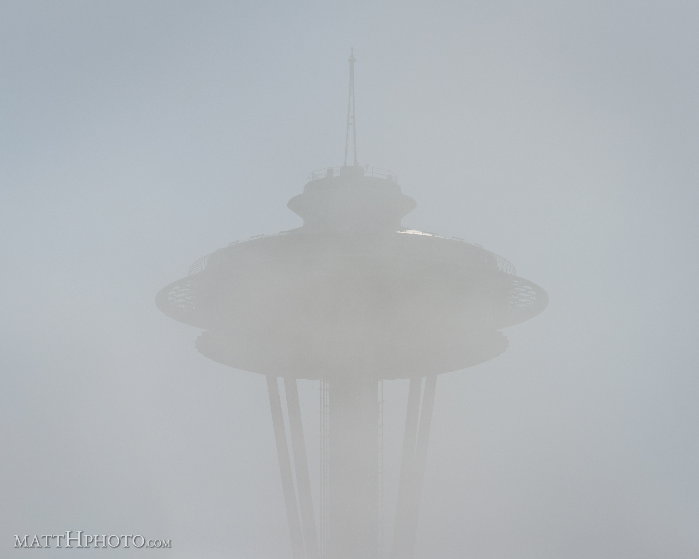 Space Needle in the fog, from five blocks away. Lingering smoke from the BC wildfires also contributes to the haze.