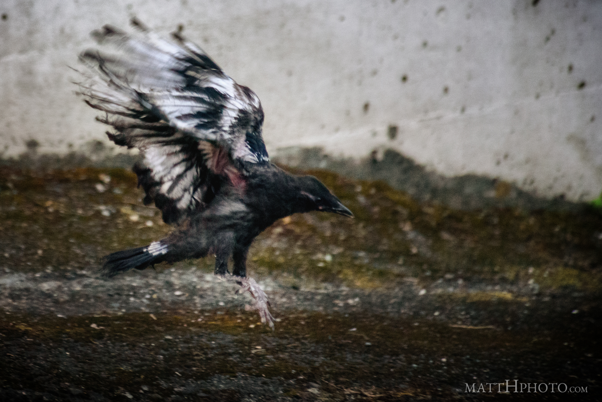 young crow learning to fly in a Seattle parking lot