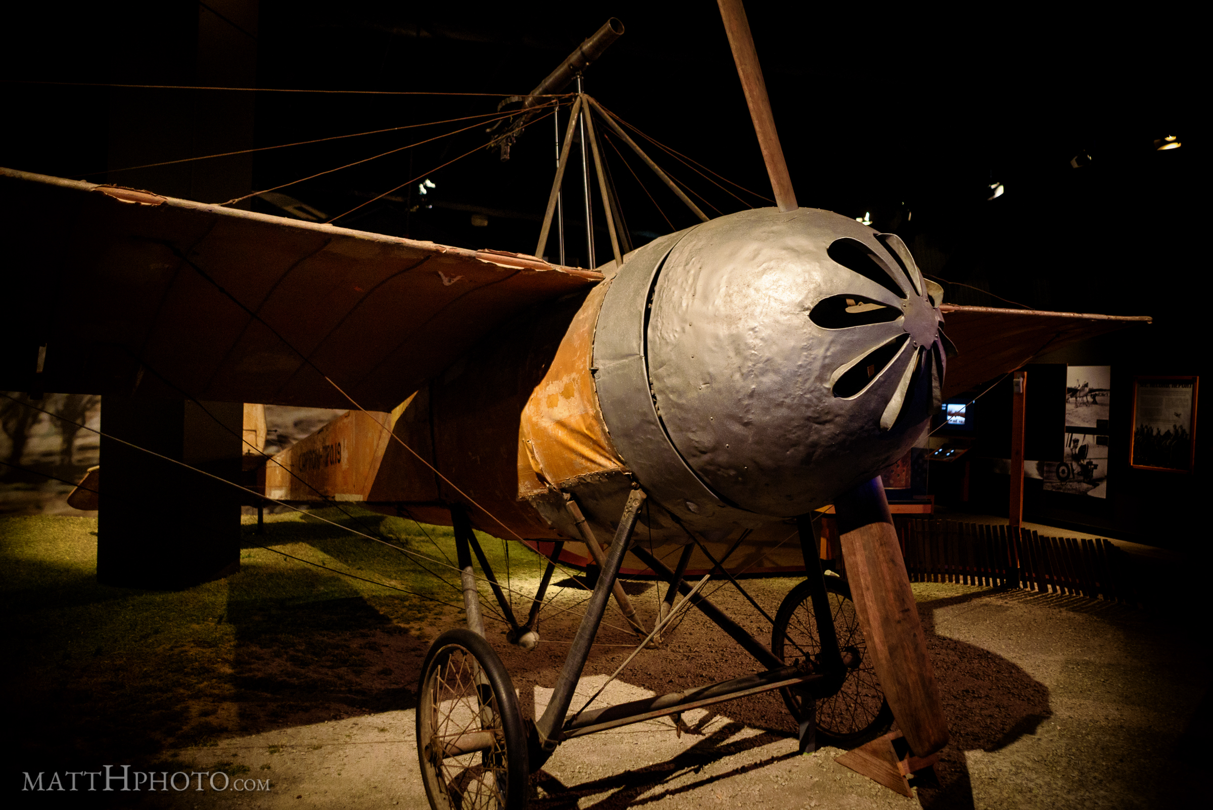 Prototype of early fighter aircraft, with machine gun above the propeller arc. 1914.