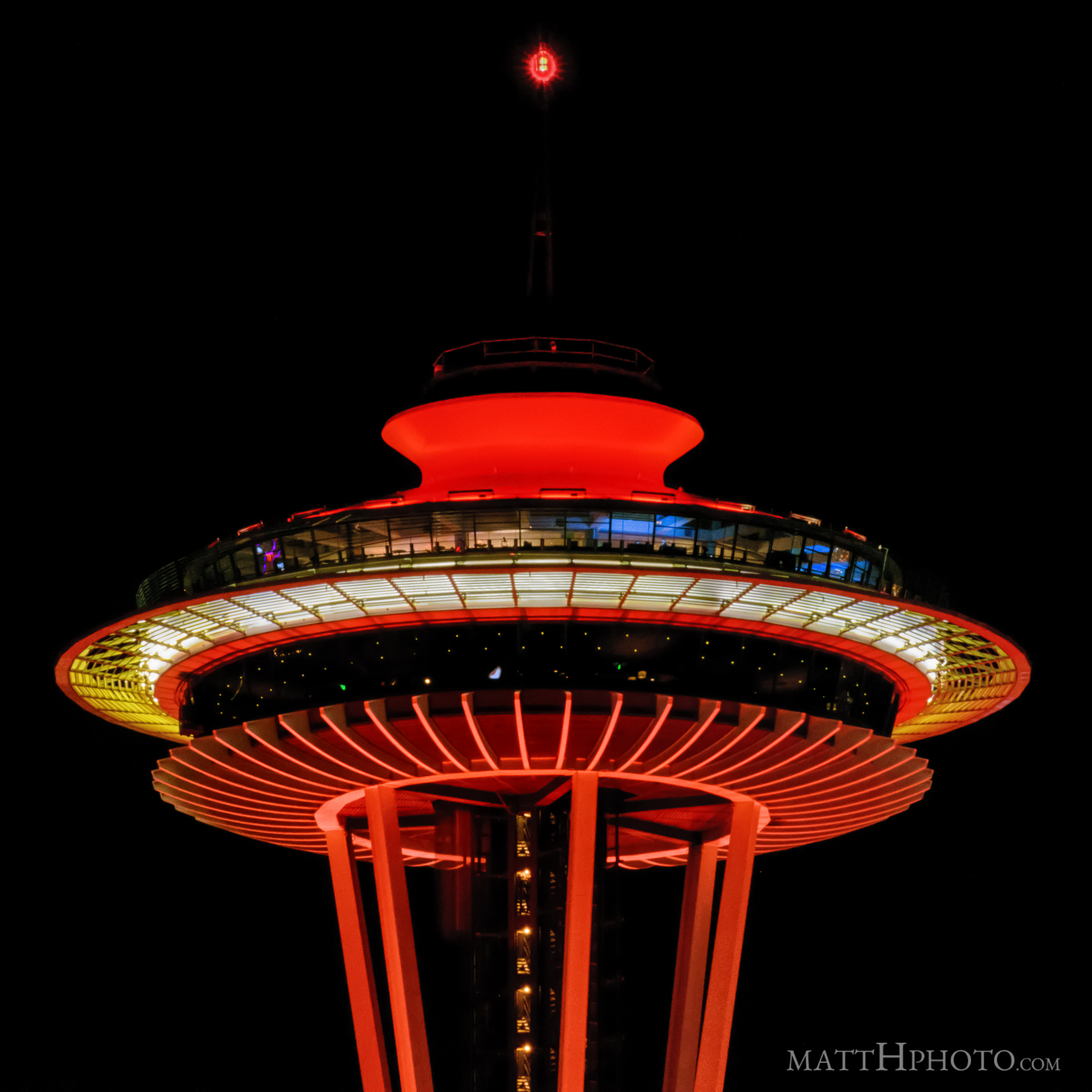 Space Needle lit in red for the 125th anniversary of Seattle University