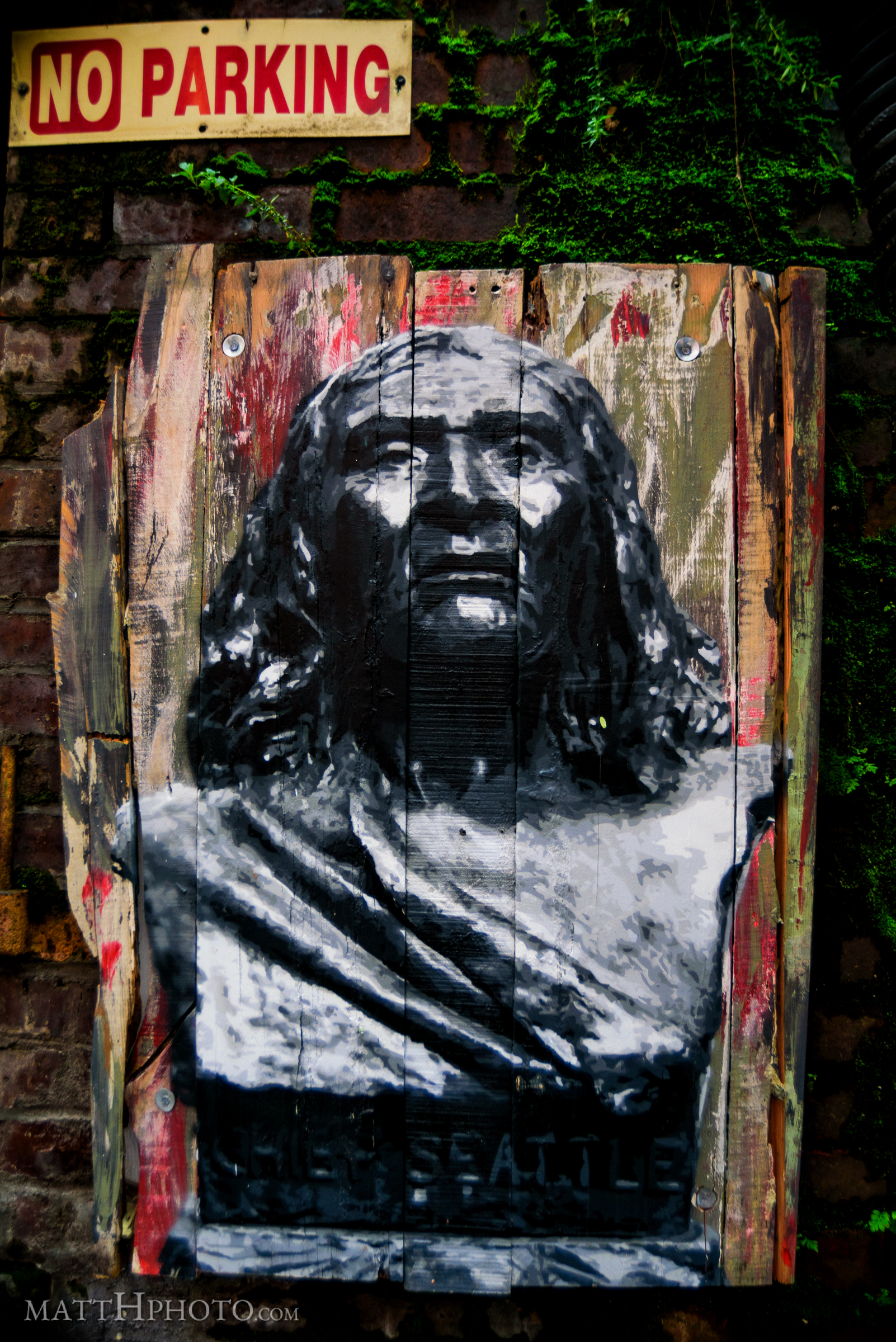 Chief Seattle artwork in alley, near 1st and Washington, Pioneer Square.