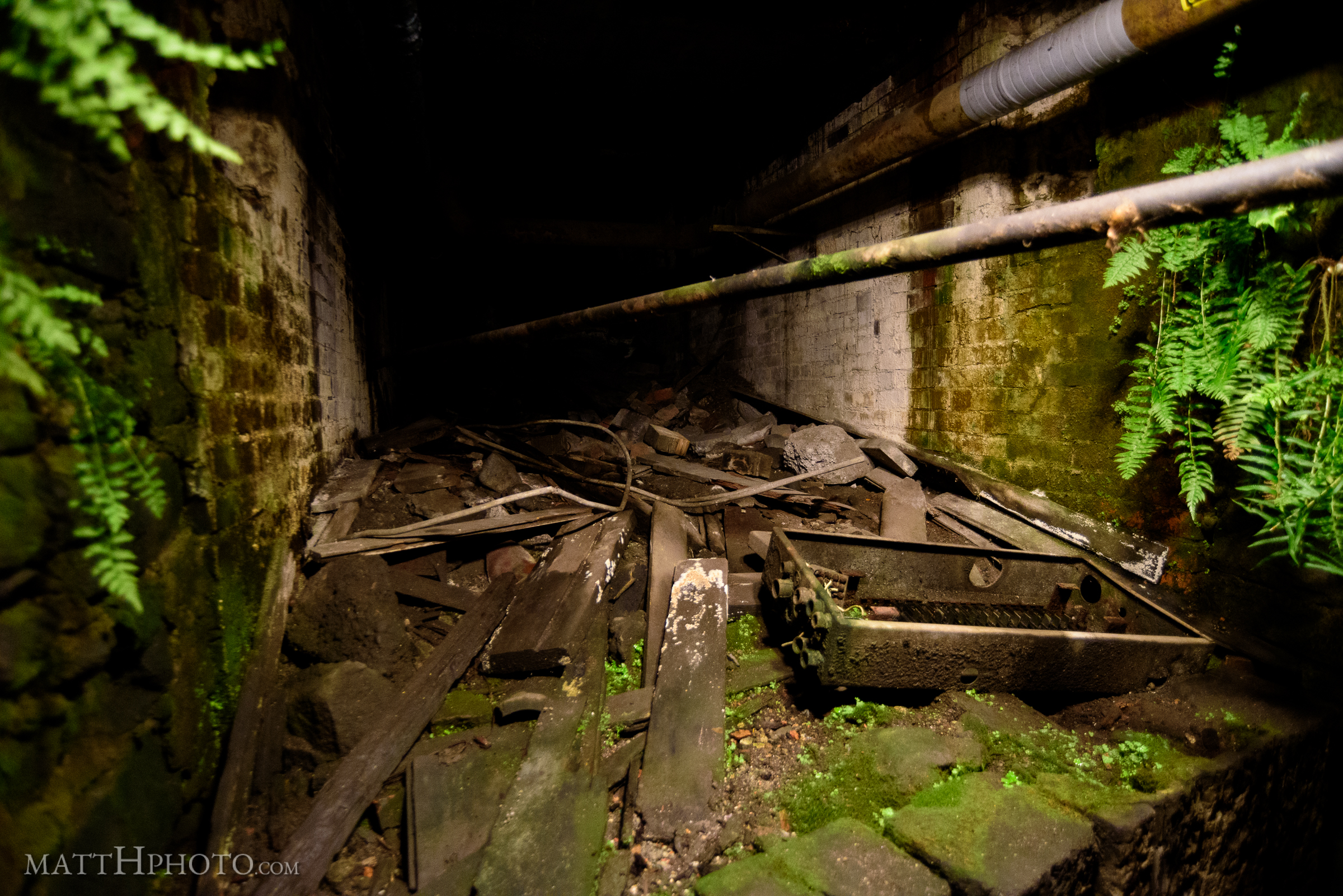 Debris-filled crawlspace under 1890s Seattle bank building, with ferns surviving on artificial light and moisture that seeps through masonry.