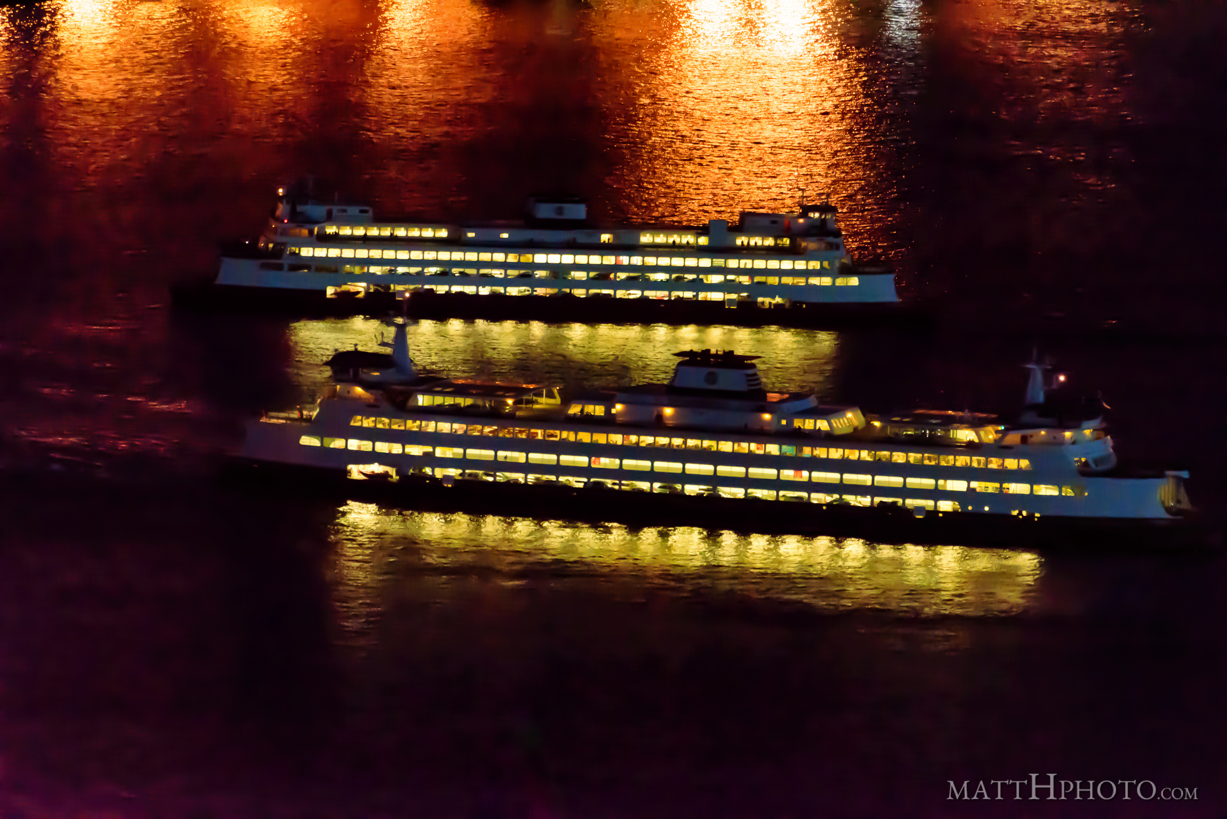 Washington State Ferries near Colman Dock, Seattle. Top boat is returning from Bremerton, bottom boat is departing for Bainbridge Island.