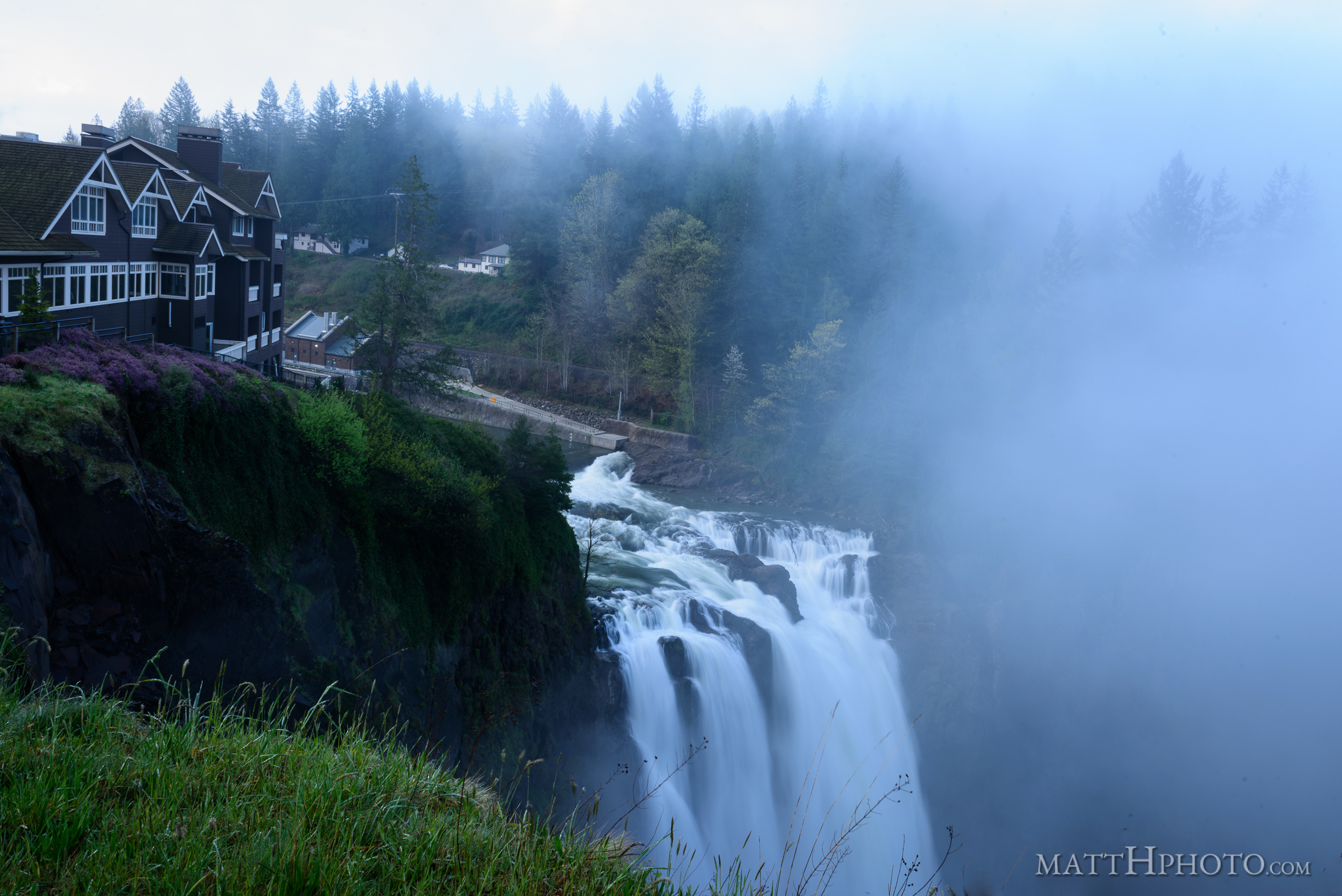 Salish Lodge and Snoqualmie Falls, as seen about 9 am, before the morning mist clears.
