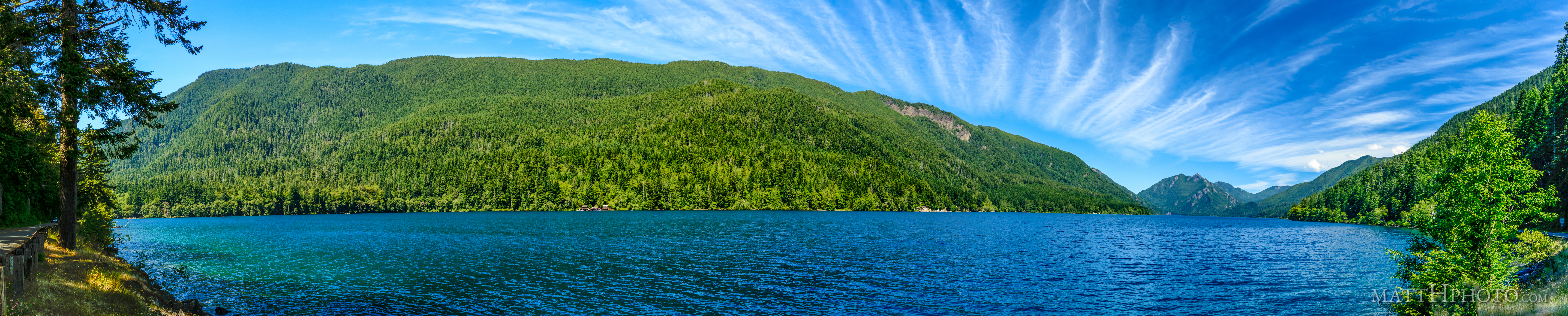 Looking north across Lake Crescent at Pyramid Mountain. Mount Storm King is in the distance, right of center, and Aurora Peak rises on the right side of the frame. Panorama merge from 9 images, 18mm (crop sensor; 27mm equiv). Field of view is about 200 degrees.